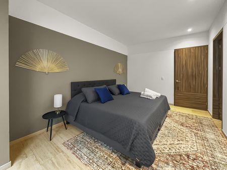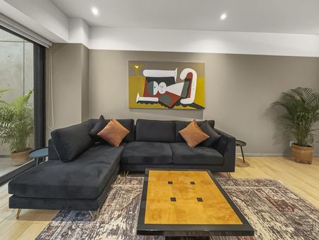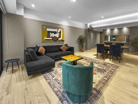 Elegante y moderno departamento amueblado en renta en Roma Norte. El amplio espacio de la sala combina a la perfección estilo y comodidad, ofreciendo el lugar ideal para relajarse o entretenerse. Las ventanas de piso a techo inundan el espacio con luz natural, creando un ambiente luminoso y acogedor en todo el departamento.