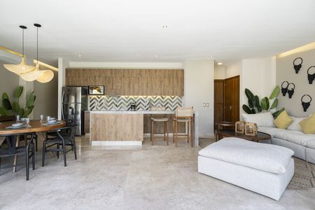 Sala, cocina equipada, comedor y lavadora-secadora