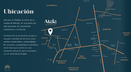 El proyecto ATALA APARTMENTS es un desarrollo habitacional ubicado en Dzitya, al norte de la ciudad de Mérida, en una zona con alta plusvalía y de crecimiento residencial y comercial.