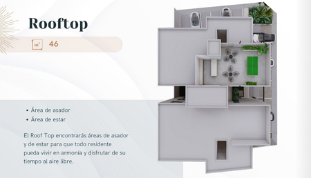 El proyecto arquitectónico se desarrolla en un edificio habitacional de 3 niveles más un Roof Top. Los 3 niveles se conforman por 12 departamentos de 1 y 2 recámaras que van desde 44 m2 hasta los 78 m2. La planta baja alberga el estacionamiento privado y áreas verdes que le otorgan a los departamentos excelente ventilación en sus espacios interiores.