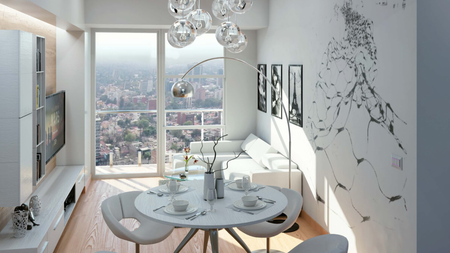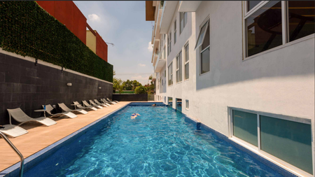 Balcón y amenidades como alberca, gimnacio, huerto, ludoteca, cowerking, sky cine, cafetería y spa.