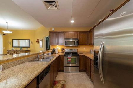 Cocina con electrodomésticos de primera calidad, encimeras de granito y gabinetes de madera personalizados.