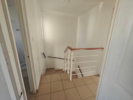 The ground floor features an open-concept living room, dining room, and kitchen, as well as a full guest bathroom. Upstairs, there are two bedrooms and a full bathroom.