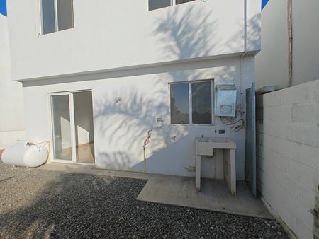 La casa ofrece un amplio patio con acceso desde el comedor, pasillo lateral, área de lavado y cochera para dos autos.