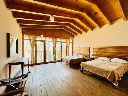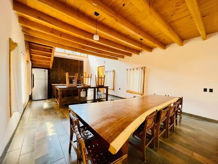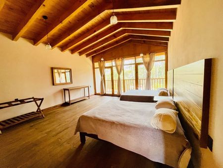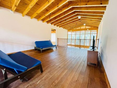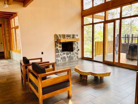 Tarraza exterior con vista al bosque, sala con chimenea , cocina equipada, amplio comedor de parota, baño completo.