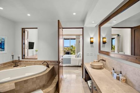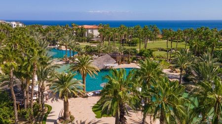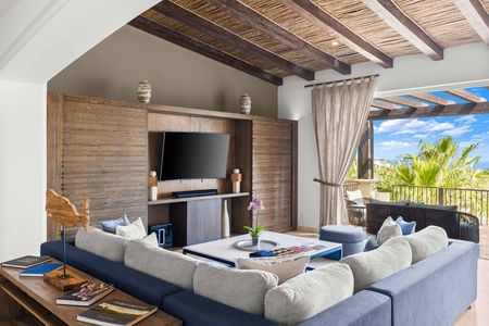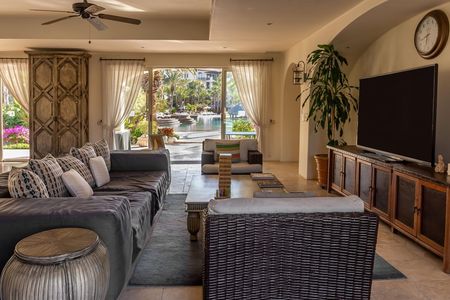 y disfrute de servicios de comida y bebida junto a la playa que pueden cargarse cómodamente en su villa. Con más de 3000 pies cuadrados de espacio con aire acondicionado, esta villa ofrece un ambiente hogareño, con cuatro dormitorios y 4,5 baños. Ofrece un amplio espacio para que familiares y amigos se reúnan, ya sea haciendo una parrillada en el patio o disfrutando de una película en la pantalla grande después de un día lleno de aventuras en Los Cabos.