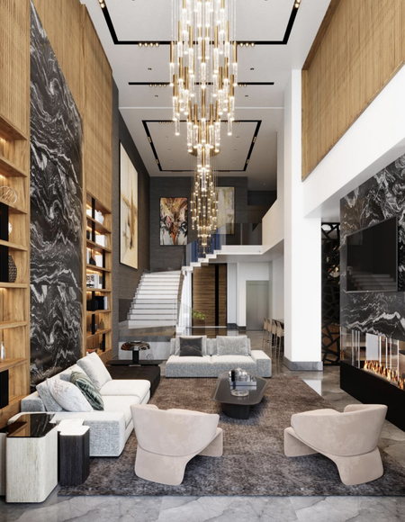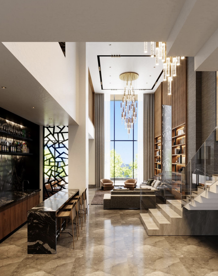 - Recibidor, escaleras, sala y bar de doble altura.