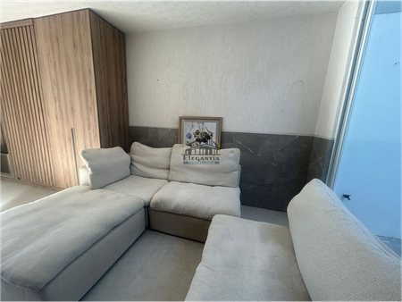 Sala amplia con sofá modular de 4 piezas, recibidor de madera y Tv de 32"
