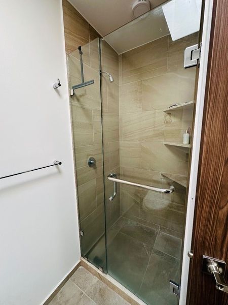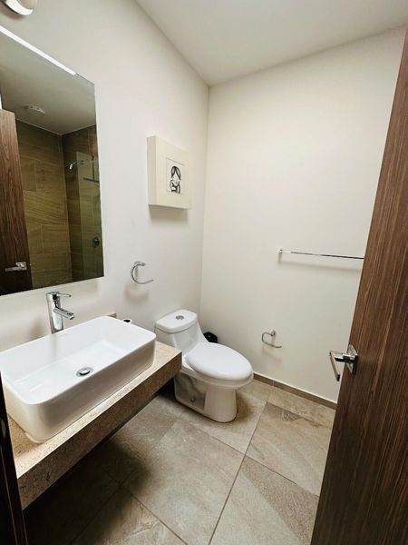 Recamara principal con cama matrimonial con vestidor y baño.