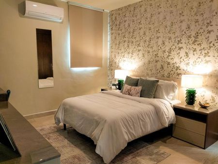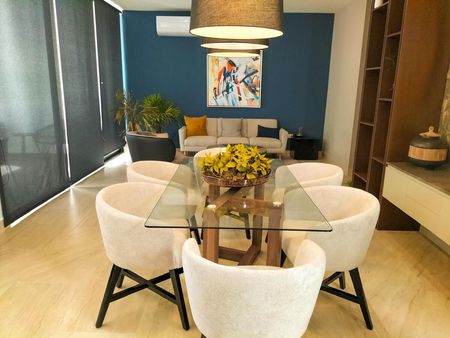La casa se renta amueblada y equipada con aires acondicionados, mobiliario en sala y comedor, asi como la cocina con alacenas (no incluye estufa ni refrigerador).