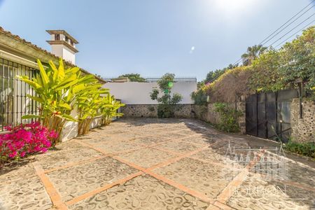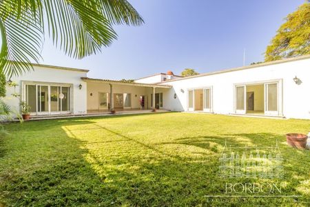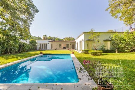 La casa cuenta con tres amplias y luminosas recámaras, cada una con clóset y baño completo. Un espacioso salón y comedor se conectan con una terraza con vistas al jardín, que incluye árboles maduros y una piscina, todo distribuido en un solo nivel. La cocina integral incluye despensa y área de lavandería, mientras que el área de servicio cuenta con dos recámaras y un baño, garantizando funcionalidad y comodidad.