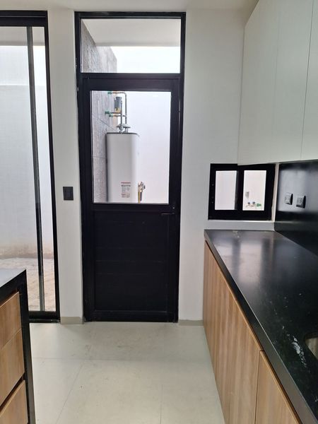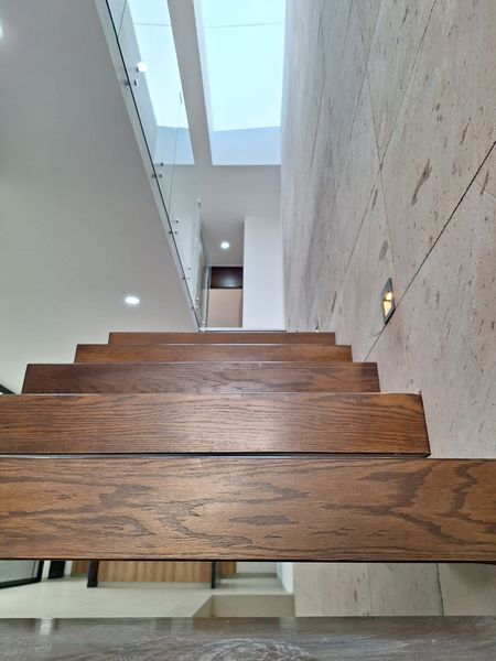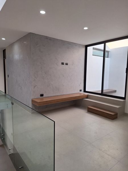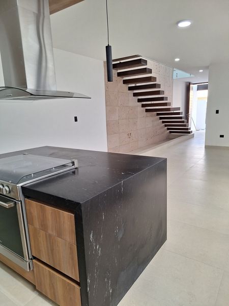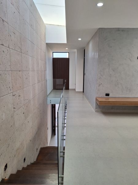 Modernas escaleras de madera conducen a la planta alta, donde se ubica la recámara principal, con un amplio vestidor y baño completo, así como una recámara secundaria con baño y closet.
