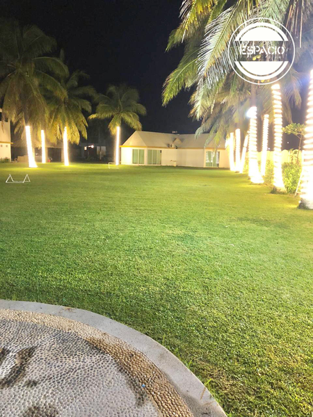 Gran jardín, y área de alberca con muebles de exterior.