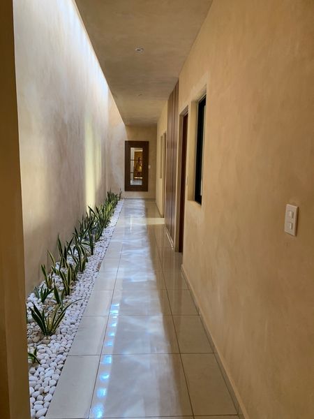 Pasillo distribuidor con área para jardinera e iluminación de tragaluces.
