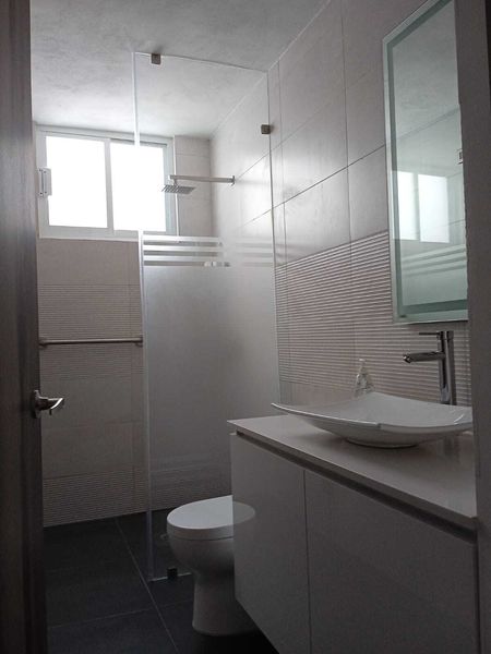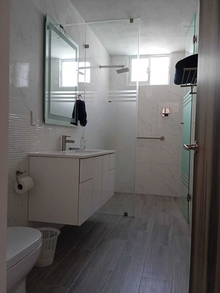Baños con cuarso, mdf al alto brillo, cristal templado, espejos, lámparas y persianas
