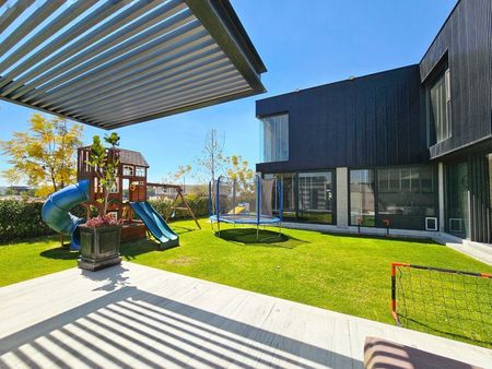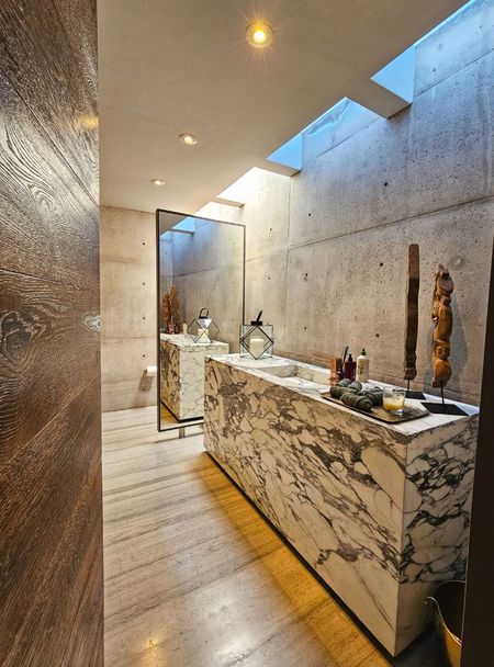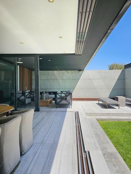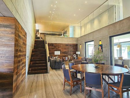El diseño contemporáneo presenta una fusión única de concreto y madera de nogal, creando una estética impresionante que evoca una sensación de calidez y refinamiento. Con un total de cuatro habitaciones, cada una con su propio baño completo, esta residencia ofrece un espacio amplio y privado para toda la familia y los invitados.