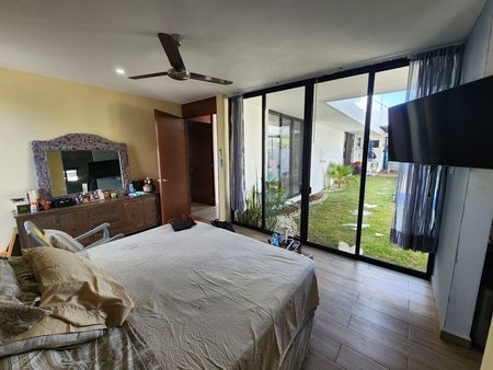 Casa de una planta en venta con cuatro recámaras con baño y espacio de vestidores, uno sin baño, en privada con amenidades y paneles solares en Mérida Yucatán.