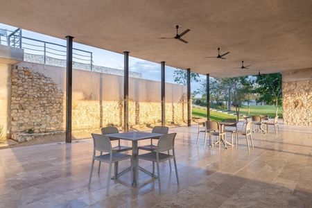 Terraza techada, de 9.70m x 4.00m, con vistas al jardín principal y área de piscina