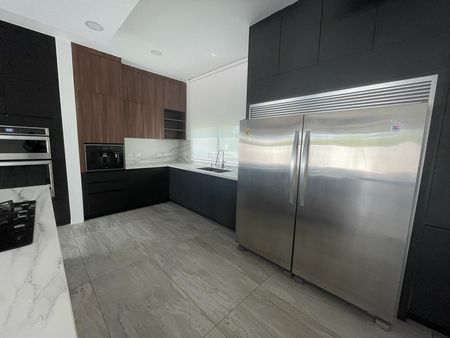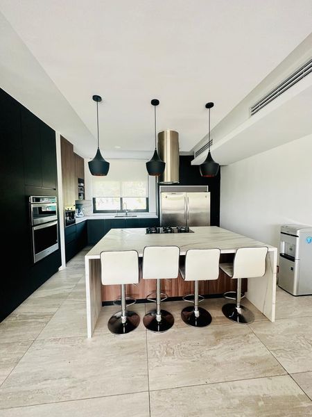 - Cocina totalmente equipada con barra de Antonili estilo americano y electrodomésticos empotrados (horno de gas, microondas, cafetera, lavatrastes, refrigerador de doble puerta incluido)
