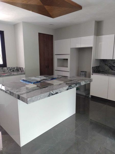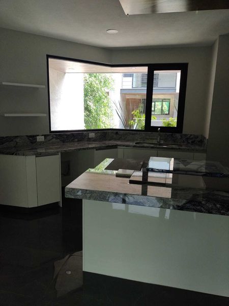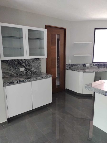 Despacho, 1/2 baño,cocina equipada abierta con isla y despensa, sala comedor , closet de blancos.