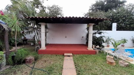 Tiene 13m de frente por 38.4 de fondo.Cuenta con 2 habitaciones, sala, cocina y comedor, 3 baños, piscina y casa de paja