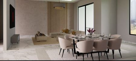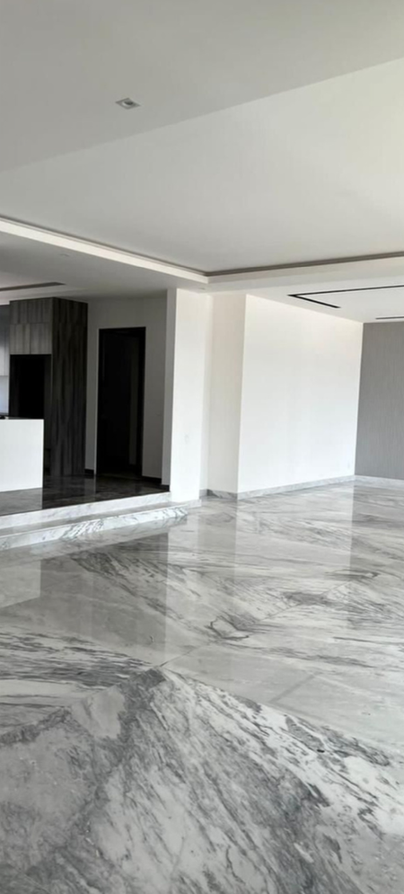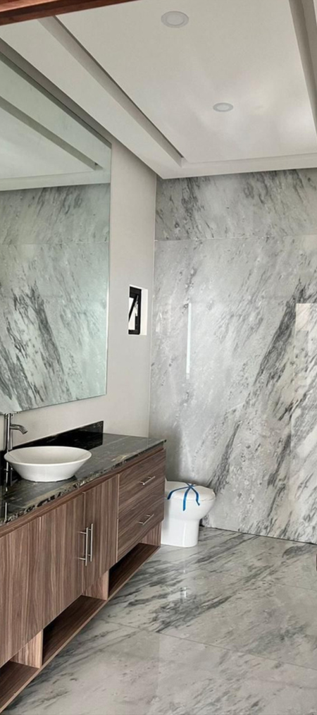 Mármoles, canteras, piedra de laja, herrerías, maderas de ingeniería color nogal, cubierta de granito en cocina, iluminación led.