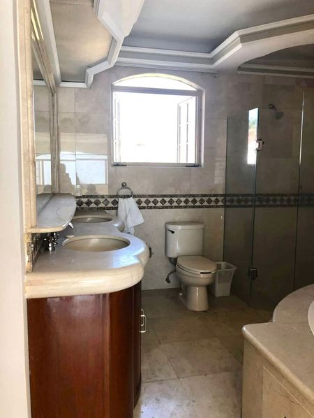 En planta alta: 4 recámaras secundarias, todas con vestidor y baño completo (una con terraza), y recámara principal con aire acondicionado, amplio vestidor, baño con tina.