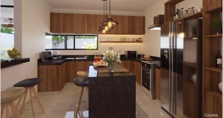 Cocina con meseta de granito y barra desayunadora
