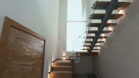 Escalera de acero con peldaños de encino y barandales de vidrio templado.