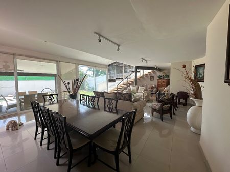 Amplia sala-comedor con ventanales de piso a techo que se integran a la terraza, jardín y alberca.