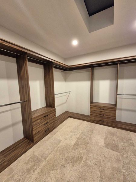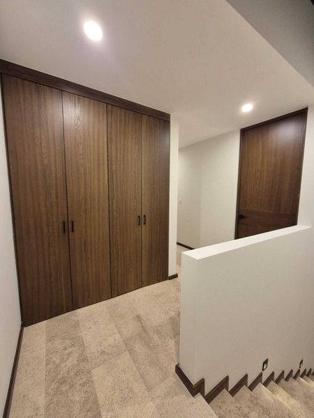 En planta baja encontrarás una cochera para dos autos, sala, comedor, amplia cocina con alacena, una recámara con clóset, baño completo, jardín y dos bodegas. En planta alta se ubica la recámara principal con vestidor y baño completo, dos recámaras secundarias con baño y clóset cada una, además de cuarto de lavado, patio de tendido y clóset de blancos.
