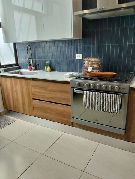 □ Cocina equipada con gabinetes de madera arriba y abajo.