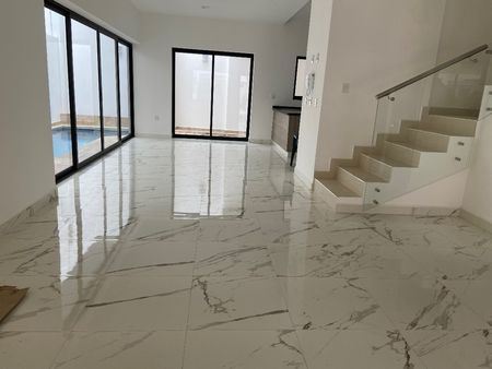 Sala. Comedor. Garaje para 3 autos. Cisterna de 8 míl litros. Alberca. Cocina integral. Medio baño. Segunda planta. 3 recamaras con baño completo y closet. Tercera planta. Sala de tv. Recamara con baño completo. Terraza.