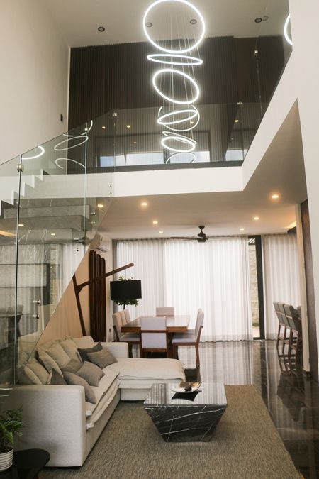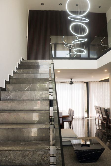 Las escaleras son amplias, forradas de mármol y cuentan con barandal de vidrio templado con techo de doble altura.