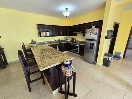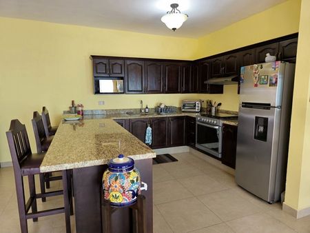 Al entrar, serás recibido por majestuosas cúpulas y arcos de ladrillo rojo, que complementan perfectamente la amplia cocina con barra, así como los espacios de sala y comedor. La propiedad cuenta con dos recámaras espaciosas y dos baños completos, la recámara principal con walking closet y baño privado. Esta increíble vivienda dispone de tres patios exteriores perfectos para reuniones familiares o simplemente para relajarte. El patio trasero es un oasis de tranquilidad, adornado con hermosas plantas locales y con acceso a la calle posterior, mientras que el patio central, con asador, te invita a subir a la terraza del segundo piso, desde donde disfrutarás de unas vistas al mar que te dejarán sin aliento. La cochera techada tiene capacidad para dos autos, con espacio adicional en la parte exterior hasta para cuatro vehículos más. La propiedad cuenta con una doble cisterna para almacenamiento de agua. Además, de que se encuentra a pocos pasos de las principales amenidades del residencial, el cual incluye seguridad 24/7, albercas, jacuzzis, parque para mascotas, área de juegos para niños, asadores, cancha de picabol y casa club.