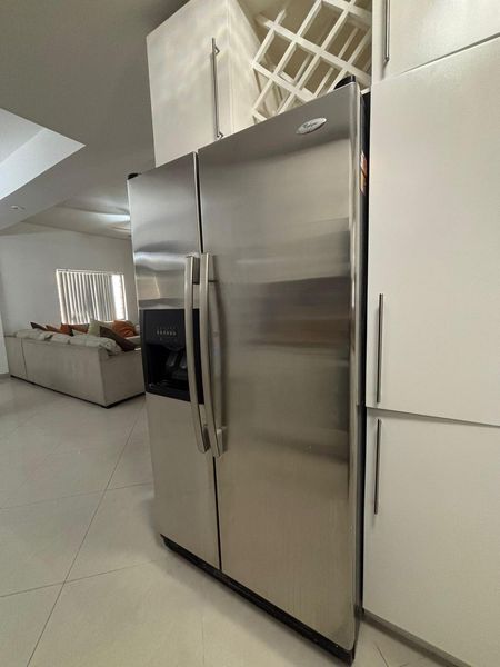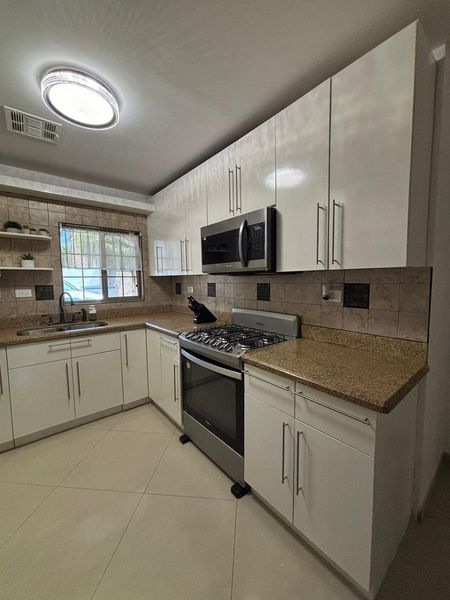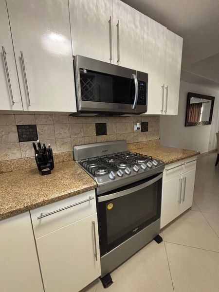 Cocina integral con estufa refrigerador, horno de microondas y algunos utensilios de cocina