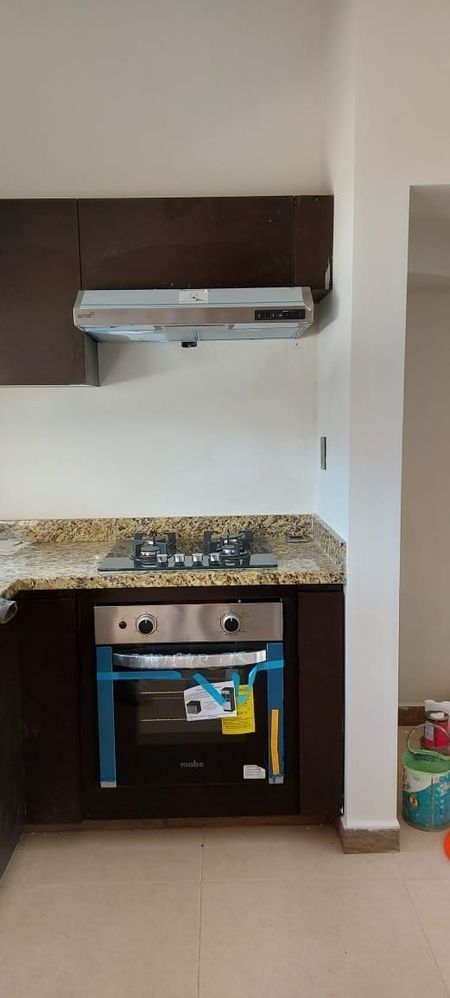 granito, campana, estufa y alacena.