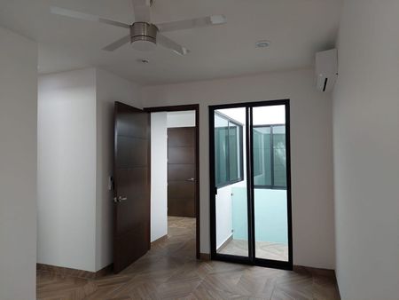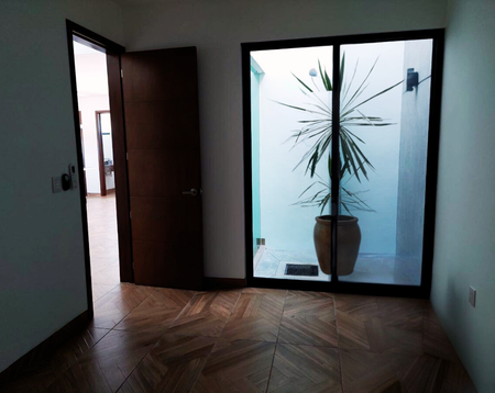 Recamara principal con vestidor, lavabo doble con cubierta de mármol, aire acondicionado y ventilador. Este cuarto recibe gran cantidad de iluminación natural y ventilación desde un segundo patio interior.