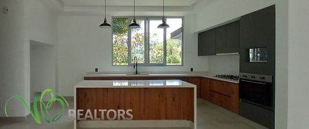 Casa con jardín totalmente plano, estacionamiento, bodega, terraza techada, 2 cuartos de servicio, cuarto de lavado y chimenea.