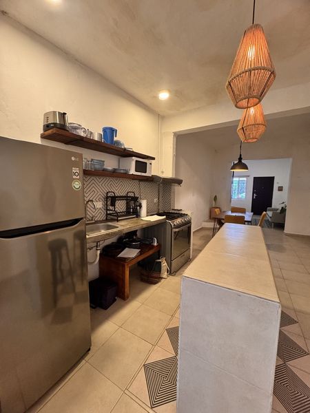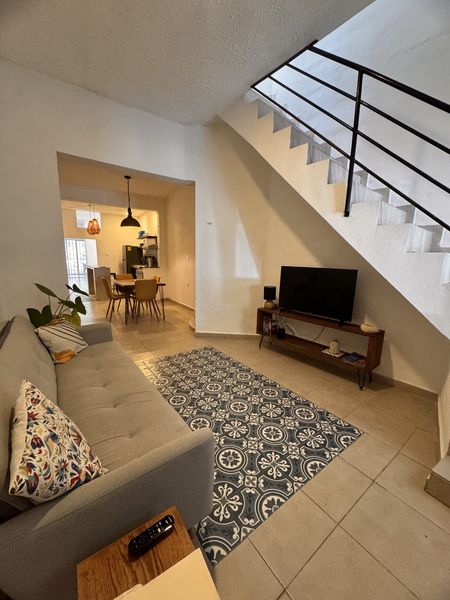 Sala comedor, un pequeño estudio u oficina, cocina equipada con barra desayunador, 2 recamaras amplias, 2 baños completos (uno en plata baja), piscina. 2 terrazas en el último nivel y la cochera para un auto.