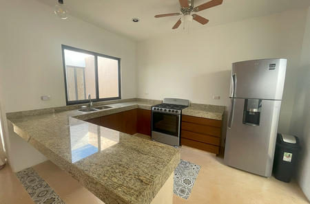 - Cocina con meseta de granito, carpintería, y ventilador de techo.