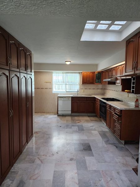 La cocina integral equipada incluye lavavajillas y amplia alacena. Además, cuenta con área de TV con opción a una sexta recámara o amplio estudio y bodega de servicio. La propiedad tiene cisterna de 5,000 litros, calentador de agua, patio de lavado, tinaco, tanque de gas estacionario, y terraza en el patio trasero con bodeguita.