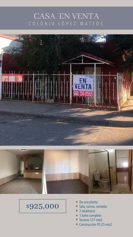 Casa en Venta Colonia López Mateos De una planta Sala ComedorCocina2 recamaras1 baño completo Terreno 127 mts2Construcción 95.25 mts2$925,000