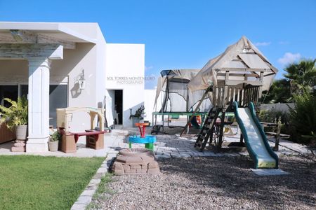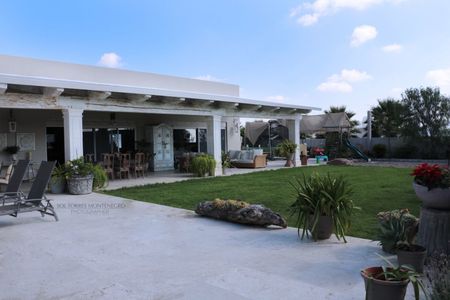 EL JARDIN TIENE RIEGO POR ASPERSION Y RODEADO DE PLANTAS Y ARBOLES.