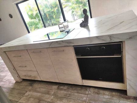 Consta de sala. Comedor y cocina en un amplio espacio con vista al área de jardines. La cocina con gabinetes e isla forrada en fino acabado.