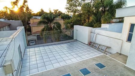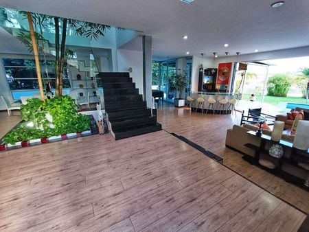 lavado ventilada y cuarto de servicio con baño completo para dos personas, en el jardín podemos encontrar una terraza techada, alberca y jacuzzi, al fondo también un área destinada para asador, todo el jardíntiene sensores láser.