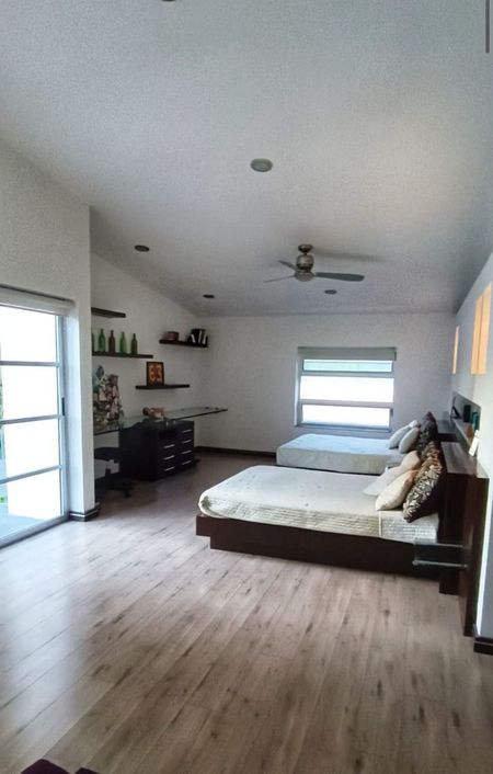 los muebles de cama empotrados cada una para 2 camas matrimoniales, también cuentan con su baño completo y walking closet, afuera de las 3 recámaras hay un espacio para estancia o área de TV.