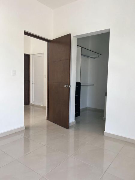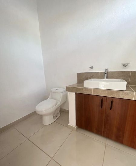 La casa cuenta con cochera, sala, comedor, cocina, patio de servicio y medio baño en planta baja; recámara principal con baño y walk in closet, recámara secundaria con closet, baño completo y terraza.
