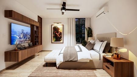Recámara principal con closet vestidor y baño.