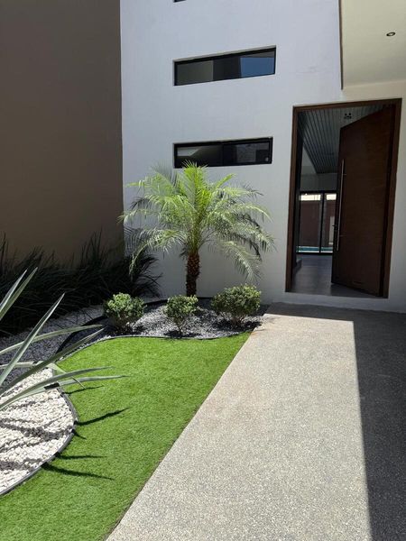 Cuenta con 375 m² de terreno y 400 m² de construcción. En planta baja dispone de cochera triple con portones eléctricos, una cocina muy amplia, oficina o cuarta recámara, baño de visitas y un patio con alberca, baños exteriores y palapa, perfectos para disfrutar reuniones familiares o sociales.